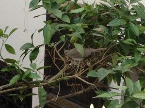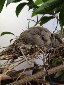 Quelques mois plus tard, avec l’arrivée du printemps, nous avons donc découvert deux nids. L’un était discret car logé dans le charnière de la porte du grand salon. Il abritait des espèces de moineaux qui, paraît-il, sont marrakchis car on ne les trouve que dans cette ville. Le second construit par une colombe imprudente était au départ tout autant camouflé, mais plus en proie au danger, puisque niché sur une branche d’oranger.